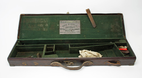 A BRASS CORNERED SINGLE LEATHER GUNCASE, suitable for 29in. barrels (can adapt to up to 31in), lined with green baize, brass lock (key missing), one brass corner missing, the interior lid with a 'JEFFERY & CO' trade label