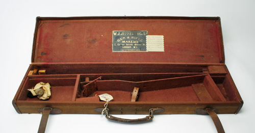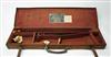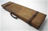 A CANVAS & LEATHER SINGLE GUNCASE, suitable for 28in. barrels (could easily adapt to 30in.) lined with pink baize, brass lock missing, the interior lid with a gold tooled leather 'WILLIAM EVANS' trade label,