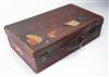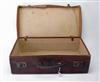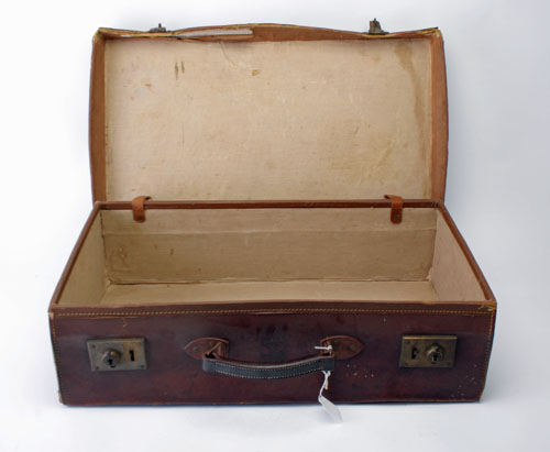 VINTAGE LEATHER SUITCASE with several hotel and luggage labels, brass locks with key the exterior lid with the monogram 'R.E.G'