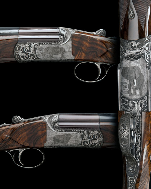 hold-open toplever, manual safety with integral triggerplate release, non-selective single trigger, exquisitely engraved with game scenes in bulino style, the left side with a rhino, the right with a cape buffalo and the underside with a bull elephant, the remainder of the action and furniture carved in high relief with stylised acanthus and foliate designs on a dark stippled background, the triggerplate signed 'M. VOLPI. L. BERTELLA. ACCADEMIA IL BULINO', 15 1/4in. highly-figured pistolgrip stock with cheekpiece, engraved pistolgrip-cap (with trap) and including 1/2in. rubber recoil pad, weight 8lb. 3oz. (rifle) and 7lb. 9oz. (shot), in its universal case with original certification