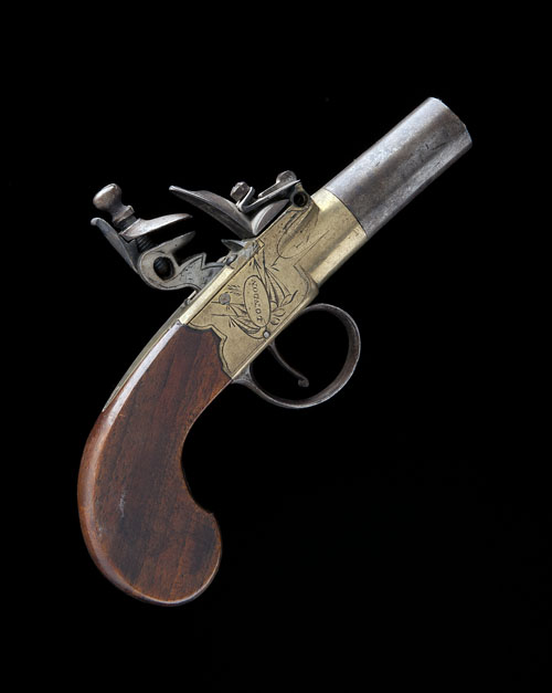 A 40-BORE FLINTLOCK BOXLOCK BRASS-FRAMED POCKET-PISTOL, no visible serial number,