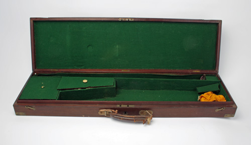 A BRASS-CORNERED MAHOGANY SINGLE PERCUSSION GUNCASE, fitted for 30in. barrels, re-lined with green baize, the exterior lid with a flush fitting brass carry handle