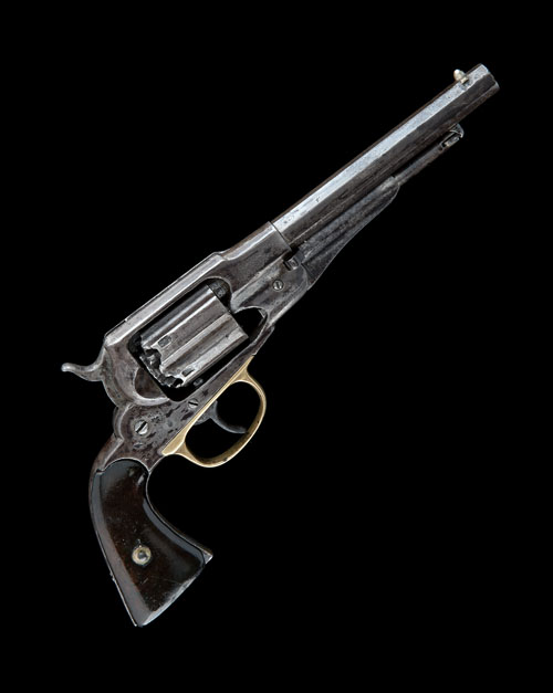 circa 1863, with octagonal 6 1/2in. barrel (markings erased), conical fore-sight, sighting groove to the top-strap, chamber with full-length flutes, plain iron frame, brass trigger-guard, two-piece smooth walnut grips and hinged under-barrel rammer, the whole stained with areas of re-finishing and mild pitting
