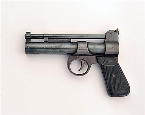 A .177 SPRING AIR-PISTOL SIGNED WEBLEY & SCOTT, MODEL JUNIOR, batch no. 3628, circa 1965, with 6in. barrel, blued air-chamber, adjustable rear-sight and black chequered hard-rubber grips, much original finish
