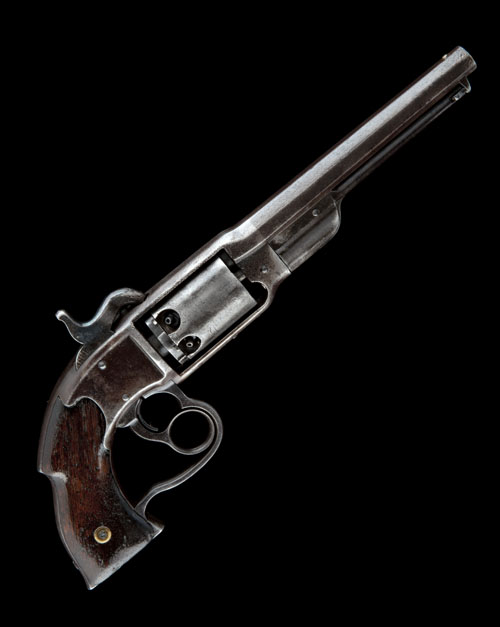 circa 1862, with octagonal 7 1/8in. barrel, bead fore-sight, standing notch rear-sight, the top-strap signed 'SAVAGE R.F.A. CO. MIDDLETOWN, H.s. NORTH PATENTED JUNE 17, 1856, JAN. 18 1859, MAY 15, 1860', plain cylinder with rear ratchet locking, plain iron frame with off-set centrally mounted hammer, heart-shaped trigger-guard, plain walnut grips and hinged under-barrel rammer, the whole stained with some shallow pitting