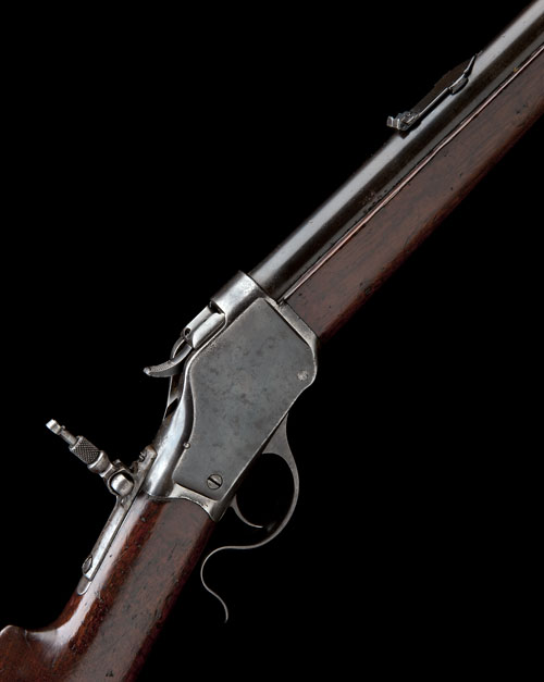 circa 1890, with heavy round slightly tapering 30in. barrel, the top signed 'MANUFACTURED BY THE WINCHESTER REPEATING ARMS CO. NEW HAVEN CONN. USA.' together with the calibre, dove-tailed blade fore-sight, Winchester express style rear-sight with one fixed and two folding leaves, plain high-wall action, central hammer, the top-tang fitted with a 'Lyman' micro-adjustable peep-sight, walnut straight-hand butt-stock, the right hand side amateurly carved with 'J. A . STEVENS' over 'V HANOVER.' and fitted with an iron 'shotgun' heel-plate, splinter fore-end with inlaid ebony tip (refinished throughout)