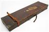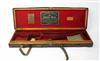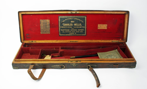 fitted for 30in. barrels, lined with red baize, central brass lock (key missing), the lid interior with a gold tooled leather 'CHARLES HELLIS' trade label, together with a 'CHARGES' label for no. 12534, the lid exterior with the monogram 'W.H.L.' and a blank brass escutcheon, handle broken