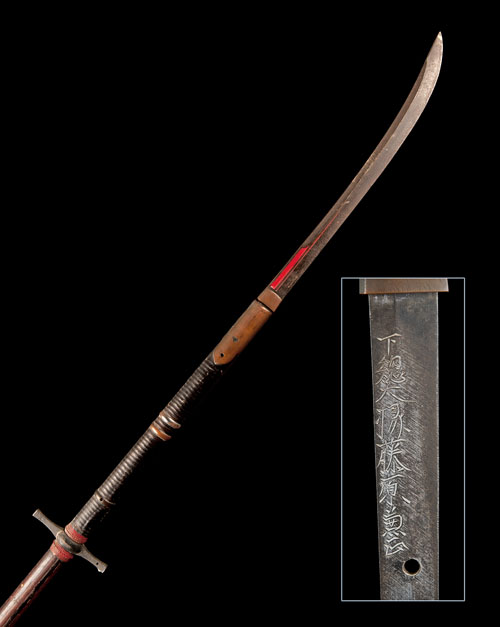 late Edo period, circa 1860, with approximately 88in. shaft and 19 1/2in. curved blade, the shaft with carved crescent to butt with copper reinforcing band, painted longitudinal lines for the first 69in. of its length, simple swamped iron cross-guard held by red-painted rope bindings, the remainder covered in ribbed black laquer with three bronze reinforcing bands, the throat in brass with pierced heart-shaped motifs, the blade with long tang with unidentified signatures to both sides and short fuller infilled with red paint (blade stained with mild surface pitting, slight flaw at tip)