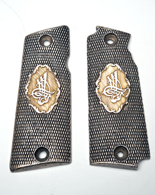 mid 20th century, for the Turkish Market, the solid chequered grips tested at 84% silver, the inlayed tested 14K gold rococco escutcheons carved with tughras in relief, the pair weighing 269g