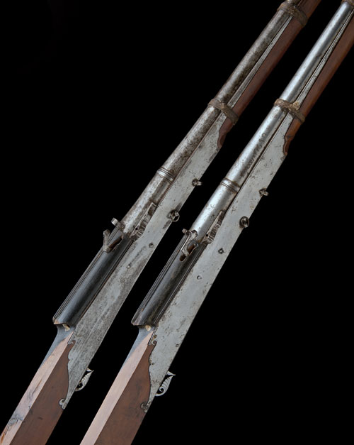 Indian, from the Jaipur arsenal circa 1880, one with 49in. barrel, the other with 50in., both of identical form, slightly tapering with swamped muzzles bearing carved and banded decoration, applied fore-sight beads (one missing), standing notch rear-sights, open priming pans, plain iron sideplates extending along the top edge of the fore-ends, wood full-stocks with rattan barrel-bands, carved iron trigger-blades and original iron ramrods