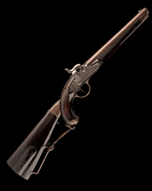 Hanoverian, circa 1845, with re-browned 11in. barrel, applied bead fore-sight, folding notch rear-sight at the breech, cross-bolt safety, two-piece top tang joining onto the backstrap with aperture for the detachable shoulder-stock, the backstrap engraved with the serial number, plain bevel-edged lockplate signed 'HARTZBERG' (indistinct), stepped tail, plain hammer, walnut full stock with brass furniture including heavy brass butt-cap fitted with an iron saddle-ring, the cap stamped 'C.H.' over 'C' over 'N.43', serpentine sideplate stamped 'I' over 'C.43' (crossed out), brass trigger-guard bow with iron tang, brass nose-cap and no provision for ramrod TOGETHER WITH a period shoulder-stock for the same model with iron serial numbered top-tang, brass re-inforcement cheeks, sliding wooden-lidded patchbox, the underside of stock with saddle-bar and ring, fitted with a leather safety strap and push-button release catch