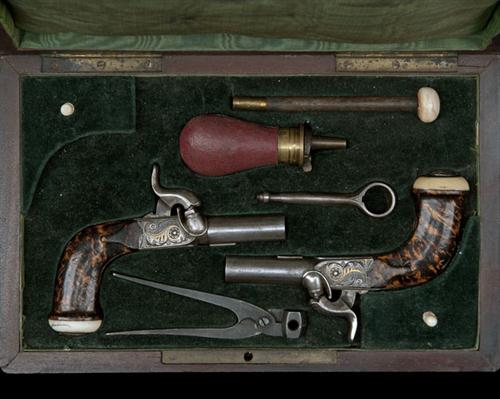 Belgian, circa 1845, with round 1 3/8in. turn-off micro-rifled barrels, squared boxlock actions with off-set central hammers and off-set nipples, the action body inlaid with four colour gold floral motifs enhanced with further engraving, fruitwood pistolgrip stocks with swollen butts decorated with a thick ivory butt-cap, centrally mounted cap-boxes with shell-shaped sprung lids, and engraved folding concealed triggers TOGETHER WITH their original mahogany storage case with brass-banding to the lid, centrally mounted rectangular brass escutcheon, the case interior with green satin lined lid and compartmented in the continental style for the two pistols and a full suite of accessories including a diminutive red morocco leather covered bag shaped flask, a scissors ball mould, a cap tin, turn-off key and an ivory pommelled loading rod