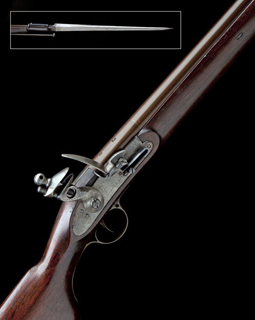 made between 1807-30, with re-browned round 39in. smoothbore barrel signed at breech 'EZEKIEL BAKER & SONS, GUN MAKERS TO HIS MAJESTY, LONDON', block fore-sight, plain slightly curved and radiused lock signed 'E. BAKER & SON', Baker-style hammer, semi-rainproof pan with tall frizzen, walnut three-quarter stock with applied semi-pistol grip (similar to the Baker Cavalry Rifle of 1827), no patch-box, brass furniture including long-eared heel-plate, trigger-guard, serpentine sideplate with additional central screw, three ramrod pipes including throat, provision for sling swivels (missing) and dome-headed iron ramrod TOGETHER WITH a period trials-type socket bayonet with spring catch working on the fore-sight complete with its original black laquered iron scabbard