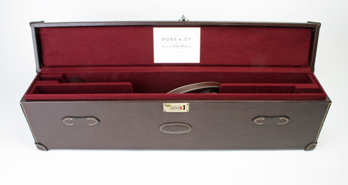 fitted for 30in. barrels, lined with maroon baize, brass combination lock, the lid interior with a 'BOSS & CO' trade label (copy)