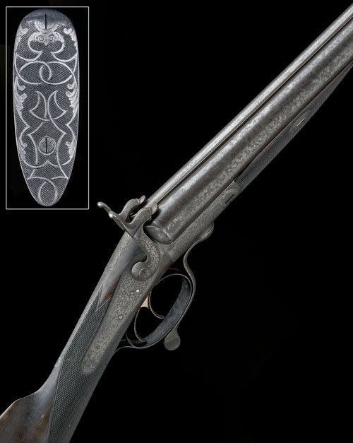 circa 1865, with browned fine-twist damascus 30in. barrels, the top-rib signed 'JOHN LYELL, ABERDEEN', scroll engraving to the breech-end of rib, starbursts engraved around the pin apertures, fully scroll engraved top-tang, border and scroll engraved back-action locks signed 'J. LYELL', fully engraved hammers, figured walnut straight-hand butt-stock chequered at the wrist, engraved iron heel and toe plates, rounded 'Jones's Patent' border and scroll engraved action with swing under-lever opening, blued border and scroll engraved trigger-guard and tang, fully chequered splinter fore-end with horn tip, the whole retaining much original finish throughout with some isolated patches of surface corrosion