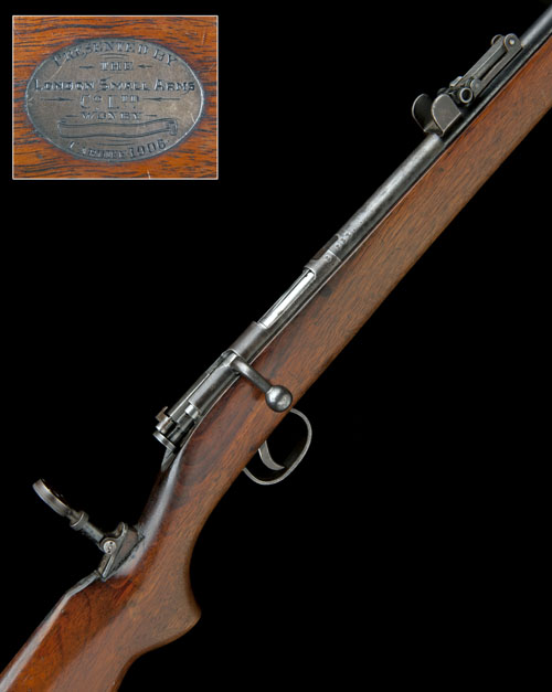 24in. nitro barrel with tangent rear sights and protector wings, block-mounted blade fore-sight with folding protector hood, barrel engraved 'L.S.A. LONDON 1906' and with 'MIN RIFLE WO PATT. stamp, the hand mounted with a folding adjustable peep sight, sling swivels, 13 3/8in. pull including brass buttplate (with trap), the right side of the stock inset with a presentation plaque inscribed 'PRESENTED BY THE LONDON SMALL ARMS CO. LTD. LONDON. WON BY. (blank banner) CARDIFF. 1906'