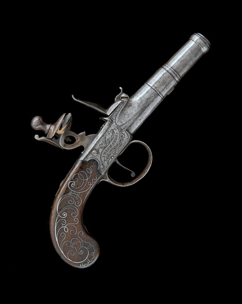 circa 1765, with1 5/8in. banded cannon-barrel, border and scroll engraved squared boxlock central-hammer action signed 'I. RICHARDS' in a banner on the right hand side and 'LONDON' in a banner on the left, walnut slab-sided butt with inlaid silver wire scrolls, trigger-guard bow safety and private proofs