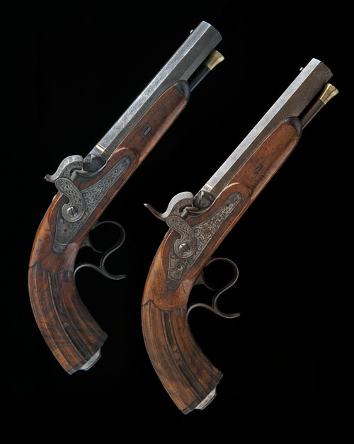 Belgian, circa 1850, with 5 3/4in. etched damascus octagonal barrels, bead fore-sights, standing notch rear-sights, twin gold lines at breech, border and scroll engraved top-tangs, border and scroll engraved 'hump-back' locks, hammers en-suite (one pistol missing hammer-spur), walnut half-stocks with fluted grips, iron butt-caps with engraved centres, scroll engraved spurred trigger-guards and brass-tipped ebony ramrods