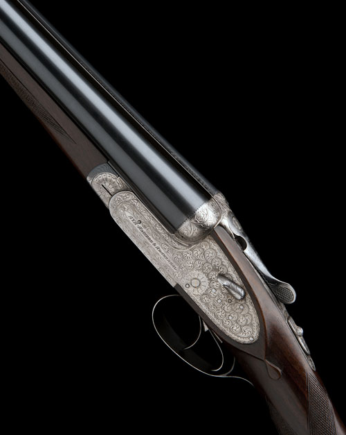 26in. nitro chopperlump barrels, 2 3/4in. chambers, bored approx. 1/4 and 1/2 choke, automatic safety, removable striker discs, hand-detachable lockplates, gold-inlaid cocking-indicators, articulated front trigger, rolled-edge triggerguard, 14 1/2in. stock including buttplate, weight 6lb. 9oz.