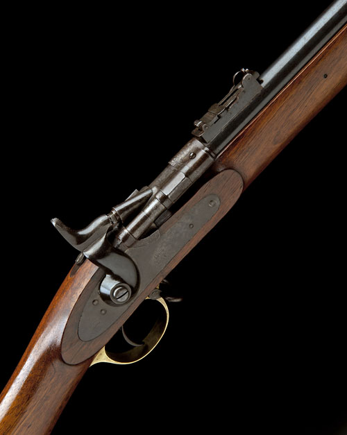 dated for 1863, with 36 1/2in. barrel, block and blade fore-sight, elevating ladder rear-sight, swing open breech-block with ball-detent locking catch, plain lock with 'L.A.Co.' and date stamp forwards of the hammer, crown and 'V.R. stamp to the tail, walnut three-quarter stock with brass heel-plate, nose-cap and trigger guard, three iron barrel-bands, iron swivels and ramrod, good degree of original finish