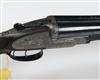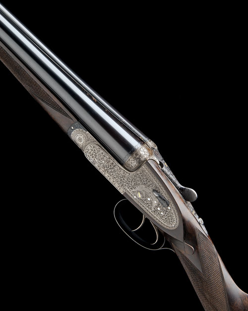 28in. sleeved nitro barrels, 2 3/4in. chambers, bored approx. 1/4 and 1/2 choke, some rusting at ribs, missing self-opening compressor, toplever gold-inlaid '2', automatic safety with gold-inlaid 'SAFE' detail, hand-detachable lockplates, gold-inlaid cocking-indicators, rolled-edge triggerguard, best bold Royal scroll engraving, bright and blued finish overall, 15 1/2in. figured replacement stock and matching fore-end wood, weight 6lb. 11oz.