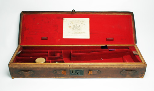 JOHN RIGBY AND COMPANY A TWO-TIERED OAK AND LEATHER SINGLE GUN / DOUBLE RIFLE CASE,