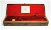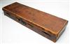 suitable for 26in. small bore shotgun or double rifle barrels, lined with red baize, brass lock (key missing), with baize lined lift out tray, the underside to take ammunition, straps and handle missing