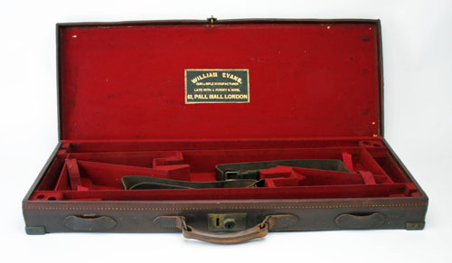 suitable for 28in. barrels one being a 12 and the other a 20-bore, lined with red baize, brass lock key missing, the lid interior with a gold tooled leather 'WILLIAM EVANS' trade label, the lid exterior with 'MAJOR M.P.PHELPS, SHERWOOD FORESTERS'