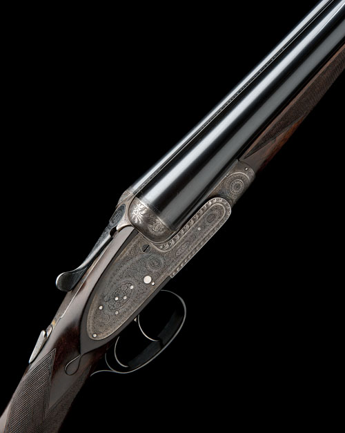 25in. nitro barrels, rib engraved 'T. WILD. 17 - 18. WHITTALL STREET. BIRMINGHAM.', 2 3/4in. chambers, bored approx. true cyl. and 1/2 choke, automatic safety with gold-inlaid 'SAFE' detail, removable striker discs, rolled-edge triggerguard, fine floral and scroll engraving with feathered borders, the triggerguard with a blank shield, retaining much original colour-hardening and finish, 14 1/4in. figured stock, weight 6lb. 5oz., in its lightweight leather case