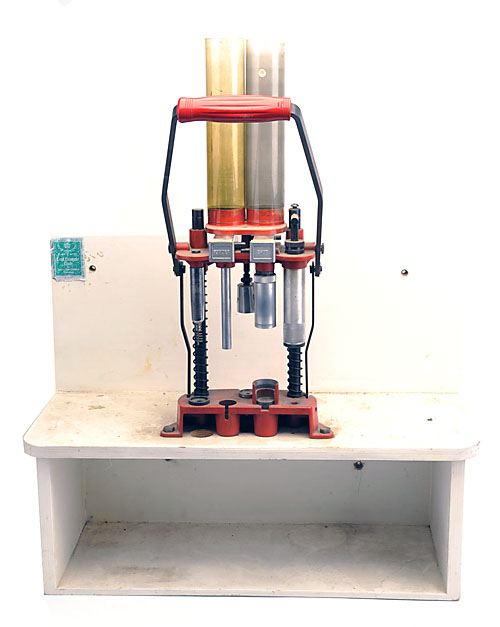 LYMAN EASY SHOTSHELL RELOADER, mounted on a wooden frame