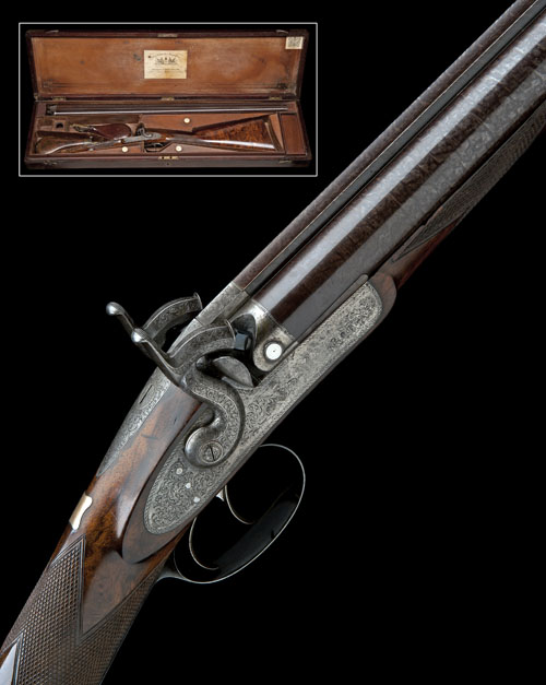 circa 1840, with 30 1/2in. browned twist barrels, signed on the rib 'GEORGE & JOHN DEANE, No.30 KING WILLIAM STREET LONDON BRIDGE', silver fore-sight, finely scroll engraved case-hardened patent breeches with platinum vents, scroll engraved top-tang, border and scroll engraved locks signed 'GEORGE & JOHN DEANE', border and scroll engraved hammers, figured walnut half-stock (slightly shortened at the butt), chequered grip and fore-end, finely scroll engraved mounts including butt-plate and trigger-guard, the latter decorated with a pointer, gold escutcheon to wrist, original brass-tipped mahogany ramrod with worm and traces of original colour TOGETHER WITH its original brass-cornered mahogany storage case with central lock and side-hook closure, 'D' ring folding handle to the lid, flush-fitting brass handle to the case-end, the interior compartmented in the English style and lined in maroon tooled Morocco leather (faded to brown), each compartment with a shaped lid and retaining a period flask, shot flask and tin of 'Joyces' percussion caps