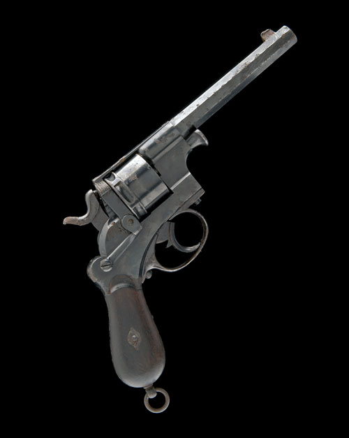 Belgian, circa 1870, with octagonal blued sighted barrel, grooved top-strap with standing notch rear-sight, plain blued cylinder with deep locking notches around rear-edge, plain blued frame with hinged loading gate, smooth two-piece walnut bag-shaped grips and lanyard ring at base, the whole with much original blued finish with some isolated patches of heavy corrosion