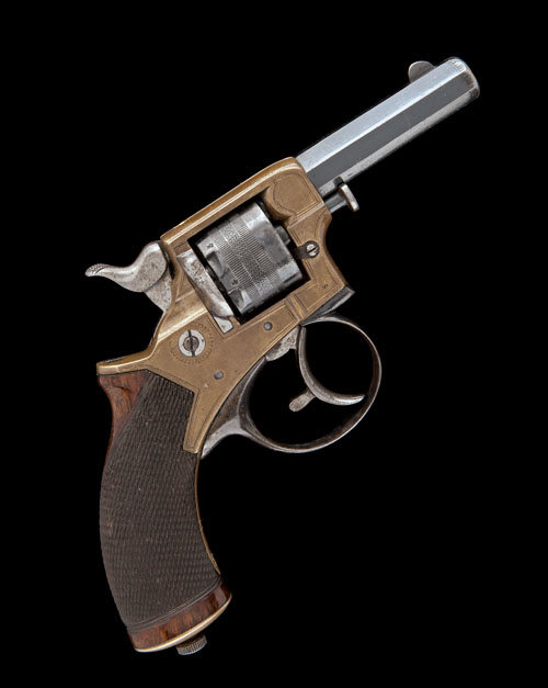 circa 1880, with blued octagonal 2 1/2in. barrel, the top-flat signed 'HOLLAND & HOLLAND, NEW BOND ST, LONDON', engraved band to the muzzle, crescent fore-sight, sighting groove to the top-strap, bronze frame with border-line engraving, blued cylinder with engraved bands, chequered walnut one-piece grip, brass butt-cap with centrally mounted removable ejector rod and blued trigger-guard, fair proportion of original finish remaining