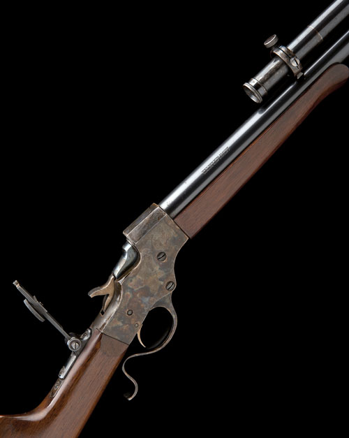 circa 1900, with heavy round 26in. barrel, open sights removed and replaced with a 'STEVENS ARMS & TOOL CO' telescopic sight of approximately four power, serial no. 461, colour-hardened falling-block action, the top-tang fitted with an adjustable peep-sight, plain straight-hand butt-stock with crescent heel-plate, colour-hardened under-lever and walnut schnabel fore-end, the whole retaining virtually all its original finish