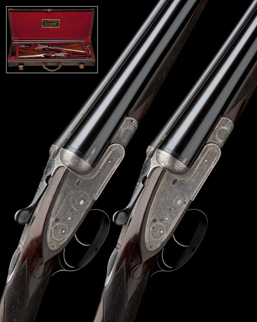 28in. nitro barrels, ribs engraved 'WILLIAM EVANS (FROM PURDEY'S) 63 PALL MALL. ST. JAMES'S. LONDON.', and gold-inlaid '1' and '2', 2 1/2in. chambers, bored approx. 1/4 and 1/2 choke, treble-grip actions, toplevers gold-inlaid '1' and '2', automatic safeties with gold-inlaid 'SAFE' details, removable striker discs, fine bouquet and scroll engraving, retaining traces of original colour-hardening and finish, 14 3/8in. well-figured stocks with engraved steel heel and toe plates, weight 6lb. 10oz., in their leather case