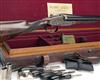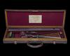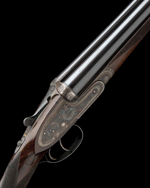 27in. nitro chopperlump barrels, the tubes engraved 'HENRY ATKIN LTD. 88, JERMYN ST. LONDON. S.W.', 2 1/2in. chambers, bored approx. 1/2 and 3/4 choke, Beesley / Purdey self-opening action, automatic safety with gold-inlaid 'SAFE' detail, articulated front trigger, best fine border, bouquet and scroll engraving, retaining virtually full original colour-hardening and finish, 14 1/2in. figured stock including 3/4in. rubber recoil pad, weight 6lb. 3oz., in its brass-cornered oak and leather case with various accessories including snap-caps, striker disc key, turn-screws, chamber brush and oil bottle