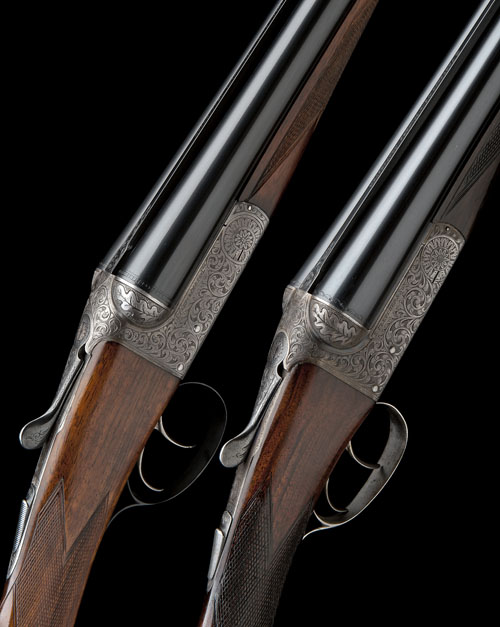25in. nitro barrels with Churchill-ribs engraved 'E. FLETCHER & SON. LTd. MAKERS. GLOUCESTER.' and 'E. FLETCHER & SON. GUNMAKERS. GLOUCESTER.' respectively, and both with a flash of scroll engraving at the breech ends, 2 1/2in. chambers, bored approx. 1/4 and 3/4 choke and 1/2 and full choke respectively, actions with carved oak leaf fences, automatic safeties, border and acanthus scroll engraving, retaining traces of original colour-hardening and finish, 14 1/4in. (replacement) and 14 5/8in. (including 3/8in. wooden extension) stocks respectively, weights 6lb. 3oz. and 6lb.