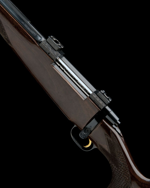 24 1/2in. octagonal nitro reproved barrel (in 2012), matt top rib, open sights and ramp-mounted blade fore-sight, left-handed receiver with quickly-detachable telescopic sight mount bases, scroll-engraved detachable box magazine, gold-washed trigger, bolt release and safety, left-handed pistolgrip stock with hogsback comb, palm swell, fishscale chequering, sculpted cheekpiece, fluted finial, sling swivels, 14 7/8in. pull including 7/8in. ventilated rubber recoil pad