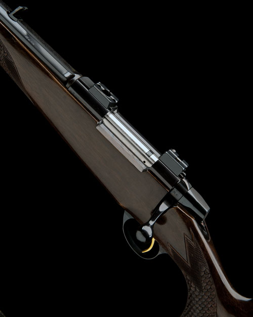 24 7/8in. octagonal nitro barrel with partially filed raised rib, open sights and ramp-mounted blade fore-sight, left-handed receiver with quickly-detachable telescopic sight mount bases, engine turned hinged floorplate, gold-washed trigger, safety and bolt release, well-figured pistolgrip stock with palm swell, sculpted cheekpiece and monte carlo comb, fishscale chequering, sculpted fore-end, sling swivels, scroll engraved ammunition trap with a labrador retrieving a duck, 14 5/8in. pull including 7/8in. ventilated rubber recoil pad