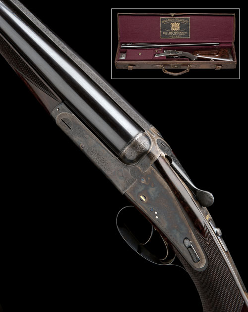 25 1/8in. nitro reproved chopperlump barrels (London proofed 1983) with matt sight rib, open sights and two folding leaf sights, ramp-mounted bead fore-sight, tubes engraved 'HOLLAND & HOLLAND . 98. NEW BOND STREET. LONDON. WINNERS OF ALL THE "FIELD" RIFLE TRIALS. LONDON.', treble-grip action with removable striker discs, elongated top strap, automatic safety with gold-inlaid 'SAFE' detail, hand-detachable lockplates, gold-inlaid cocking-indicators, fine acanthus scroll engraving, chequered front trigger, retaining virtually full renewed colour-hardening and finish, 14 3/8in. highly-figured pistolgrip stock with cheekpiece, engraved and colour-hardened steel pistolgrip-cap (with trap), sling swivels and including 1in. leather covered recoil pad, weight 10lb., in a lightweight leather case