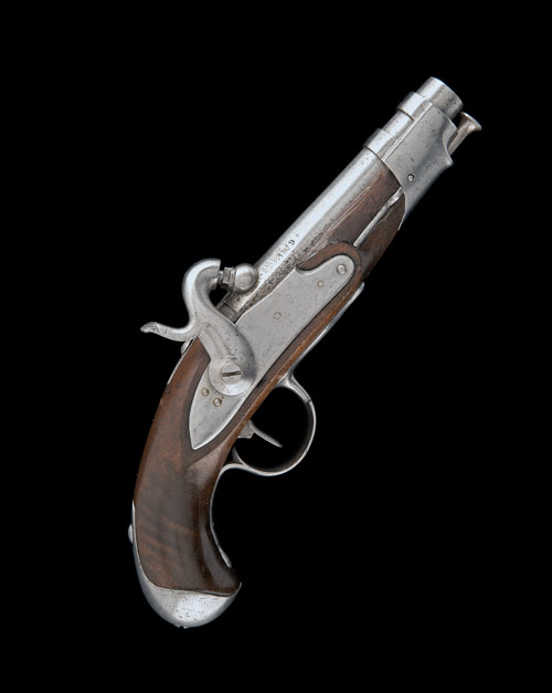French, converted from an earlier flintlock model and dated for 1819, with brushed bright tapering 5in. barrel, solid rounded top-tang, bar-action lock converted from flint with inlet repairs,walnut full-stock stamped 'TULLE' on the left hand side, brushed bright iron furniture including heavy butt-cap, serpentine side-plate and double-banded nose-cap, original iron ramrod