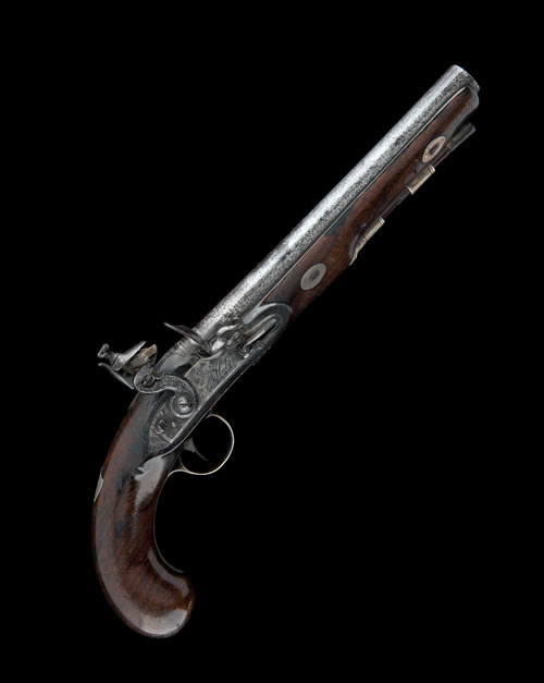 circa 1800 (hallmarked for London, possibly 1804), with round 9in. barrel banded at the breech, flat, slightly curved step tailed lock signed 'HEELY & CO' forwards of the hammer, roller-bearing to the frizzen-spring, sliding safe behind the hammer, plain walnut full-stock with bag-shaped butt, silver shield shaped escutcheon to wrist, silver trigger-guard tang and roll-edged bow engraved with a musical trophy, pineapple finial, silver ramrod pipes and horn-tipped mahogany ramrod (exposed iron surfaces stained with some mild pitting)