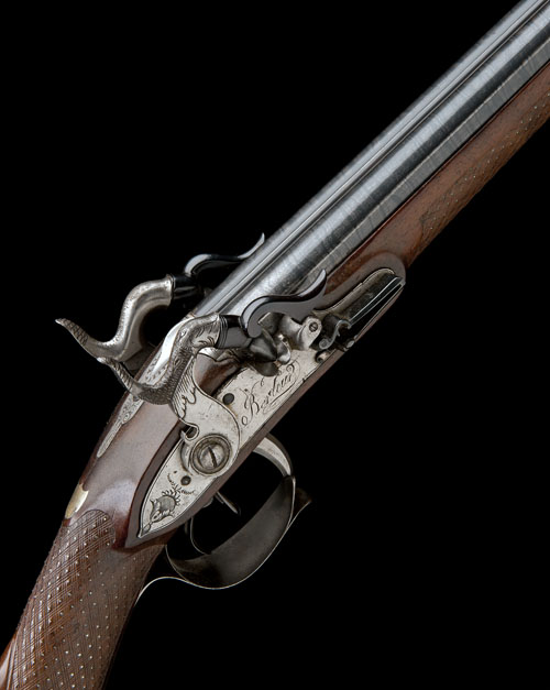 circa 1800, converted from flintlock, with re-blued 32in. twist barrels, bead fore-sight, eared rear-sight notch to the border and scroll engraved top-tang, flat border-line engraved locks with flowers engraved to the pointed tails, signed 'BERLEUR' in script on the right and 'GUILLAUME' on the left, the original frizzens converted into nipple-protectors and safeties, dolphin headed hammers, figured walnut semi pistol-grip half-stock with radiused comb, skip-chequering to the fore-end and wrist, each intersection embellished with a silver pin, raised cheek-piece, re-blued border engraved iron heel-cap, engraved trigger-guard tang, the bow engraved with a lion, iron carved and engraved floral bouquet finial supported by a satanic mask, iron rococco fore-end cap engraved with serpent-tailed cherubs, carved ramrod throat, two under-barrel ramrod thimbles and wooden repaired possible original ramrod