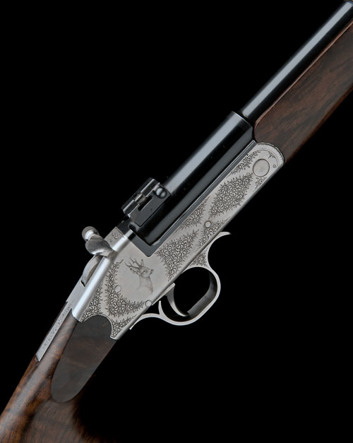 23 3/4in. nitro barrel, Bavarian proof marks, ramp-mounted bead fore-sight, the breech end mounted with a Schmidt & Bender 4-12x telescopic sight in quickly-detachable mounts, triggerguard opening, acanthus scroll engraving with portraits of chamois and roe buck, the underside with a German hunting terrier, bright finish, 14 1/2in. highly-figured pistolgrip stock with sculpted cheekpiece, sling swivels and including 7/8in. ventilated rubber recoil pad, weight 8lb. 9oz., in a Blaser universal case