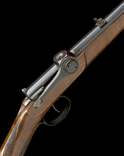 circa 1865, with blued octagonal 19in. barrel, dove-tailed blade fore-sight, dove-tailed rear-sight with elevating notch, large rotary tap with long lever mounted to the right hand side, push-button bolt release, the side of the action marked 'CAL O:,34" 6 GRAN PULVER', walnut half-stock with chequered straight-hand wrist and raised angular cheek-piece, schnabel fore-end (escutcheon missing from fore-end screw) and provision for sling, the whole with much original finish