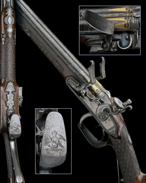 circa 1795, with 32in. twist barrels, bead fore-sight set in a boat-shaped gilded surround, triangular gilded pennants and scrolls at breech, eared rear-sight notch to the florally engraved top-tang also including an oval panel engraved with a duck, flat bevel-edged locks with pointed tails signed 'BERLEUR' in floral script on the right and 'GUILLAUME' on the left, gold-lined touch-holes, platinum lined pans with secondary waterproof pan covers concealed in the frizzens allowing the frizzens to be used as safeties, the hammer-breasts engraved with cornucopias (one hammer broken off but present), figured walnut hand-rail half-stock with radiused comb, skip-chequering to the fore-end and wrist, each intersection embellished with a silver pin, raised cheek-piece with carved flower-head, border engraved iron heel-cap, the top-spur engraved with a parrot, ornate carved and engraved trigger-guard tang and bow, the tang with raised grip-bar, the bow engraved with a crest of a Harpy sat upon a sphere with a discharging cannon, iron carved and engraved floral bouquet finial supported by two engraved entwined fish, iron rococco fore-end cap engraved with a seated bird on a branch with floral accents, carved faceted ramrod throat, two en-suite under-barrel ramrod thimbles, brass-tipped wood replacement ramrod and small square lug at muzzle for bayonet (missing), the whole with some staining and refinishing, inlet repair to right hand side of fore-end.