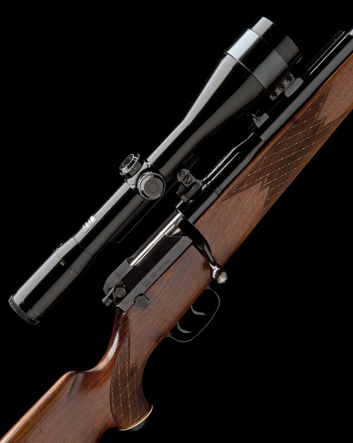 25 5/8in. nitro barrel with folding open sights and ramp-mounted bead fore-sight, the receiver mounted with a Zeiss Diavari-D 2,5-10x telescopic sight in quickly-detachable mounts, set triggers, pistolgrip stock with hogsback comb, cheekpiece, pistolgrip-cap, sling swivels, 15 1/2in. pull including 1 1/8in. ventilated rubber recoil pad