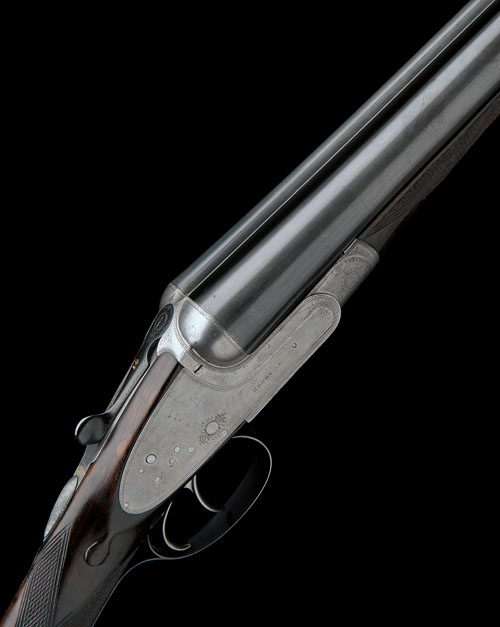 26in. sleeved nitro barrels, 2 3/4in. chambers, bored approx. imp. cyl. and 3/4 choke, toplever gold-inlaid '2', automatic safety with gold-inlaid 'SAFE' detail, beaded border engraving with spartan acanthus flourishes, brushed bright and reblued finish, 14 3/4in. figured stock including 1 1/4in. wooden extension, weight 6lb. 7oz.