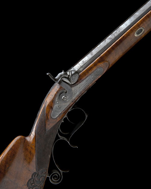 circa 1855, with heavy octagonal 31 1/2in. barrel, muzzle recessed for ball-starter, the top-flat signed 'GUSS STAHL TH. W. WITTHOFF IN FRANKFURT A M', dovetailed bead fore-sight, elevating notch rear-sight, border and scroll engraved breech end with long top-tang, border and scroll engraved 'hump-back' lock with stepped tail signed TH. W. WITTHOFF IN FRANKFURT A M', walnut straight-hand 'roach-belly' half-stock, finely chequered at the wrist with panels of carved scrolls behind, large raised cheek-piece, scroll engraved 'Swiss' style heel-plate (traces of colour), trigger-guard with scrolled pistol-grip tang and finger-spur, the bow engraved with a stag in a woodland setting framed with scrolls, double set-triggers, the finial inlaid in gold with the initials 'P.C.' in gothic lettering, horn fore-end cap and replacement iron ramrod (one thimble (unassociated) detached from under-rib but present, some staining to barrel)