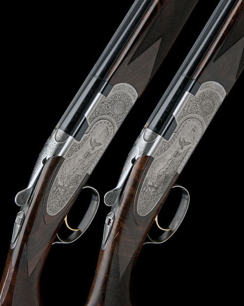 28in. nitro barrels with 5mm ventilated matt top-ribs, gold-inlaid '1' and '2', 2 3/4in. chambers, multi-chokes (no spares), hold-open toplevers, automatic safeties with integral barrel selector switches, gold-washed single triggers, floral and scroll engraving, the sideplates with game scenes, triggerplates signed 'Bottega C. Giovanelli', 14in. highly-figured pistolgrip stocks including wooden buttplates, weight 6lb. 1oz., in a universal motor case